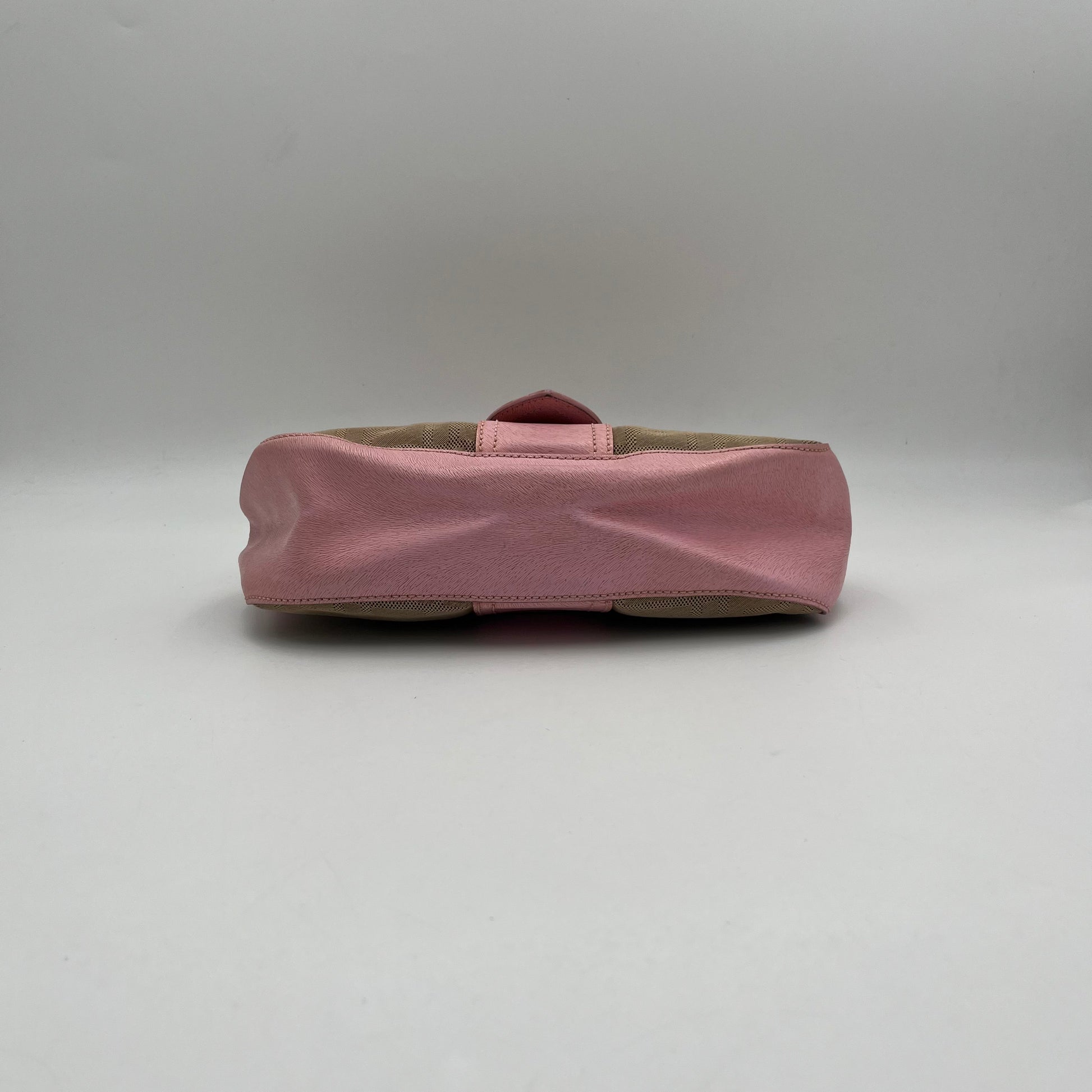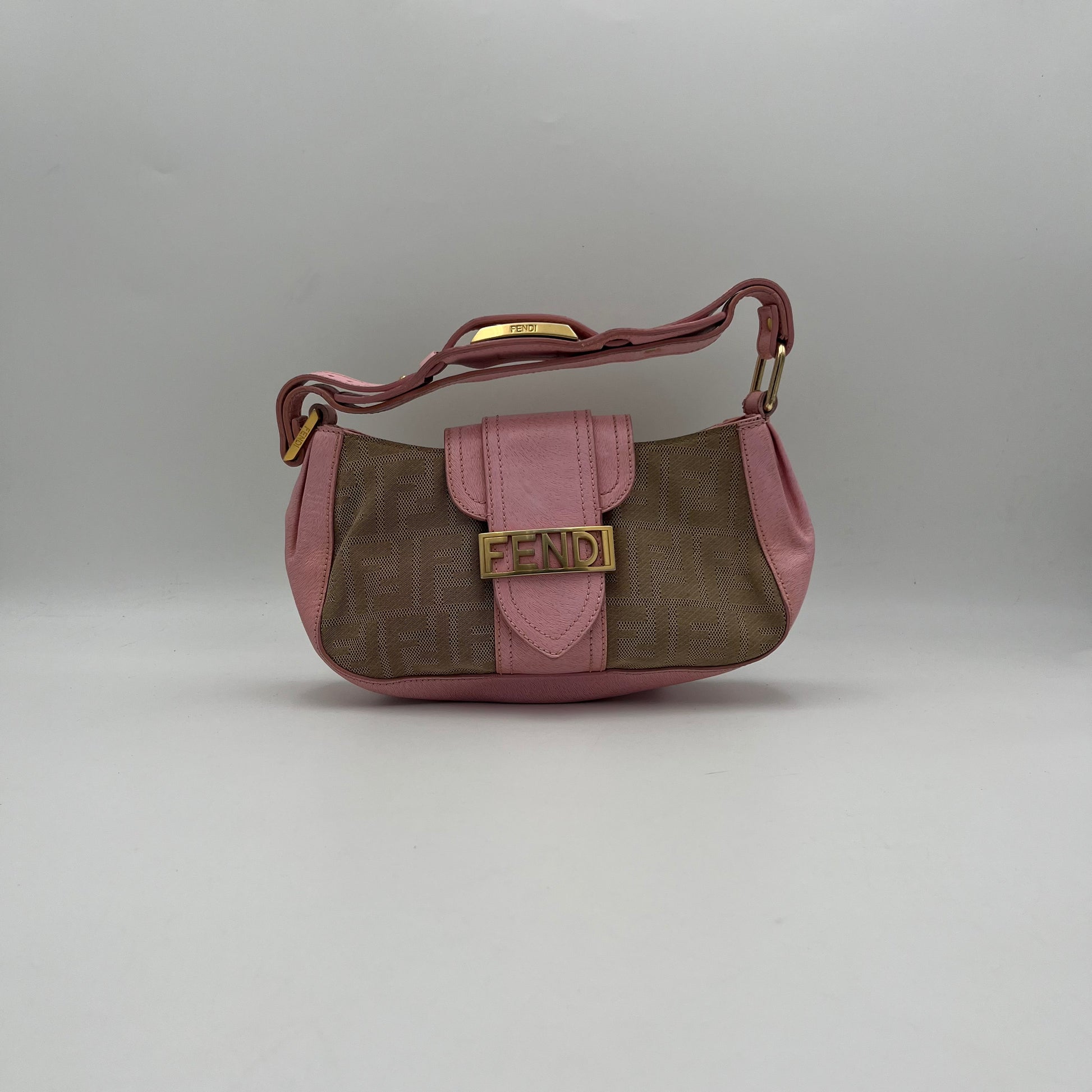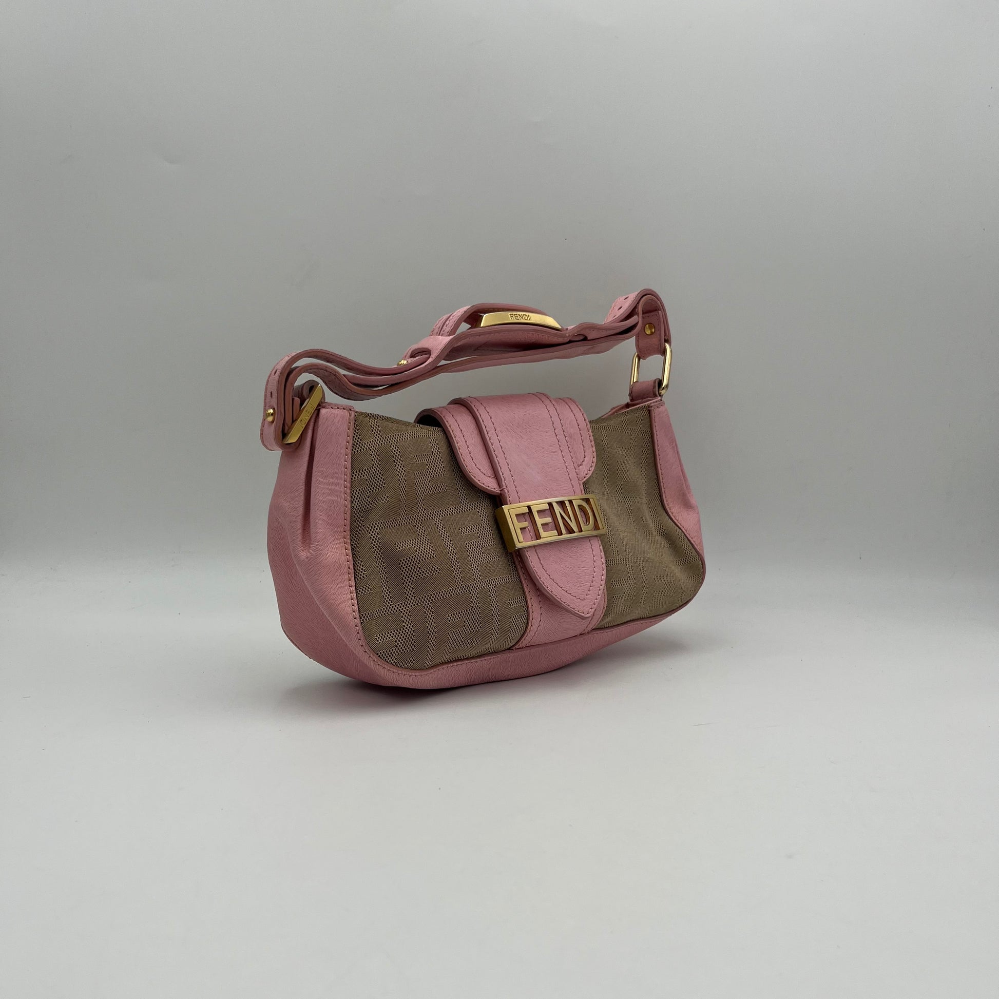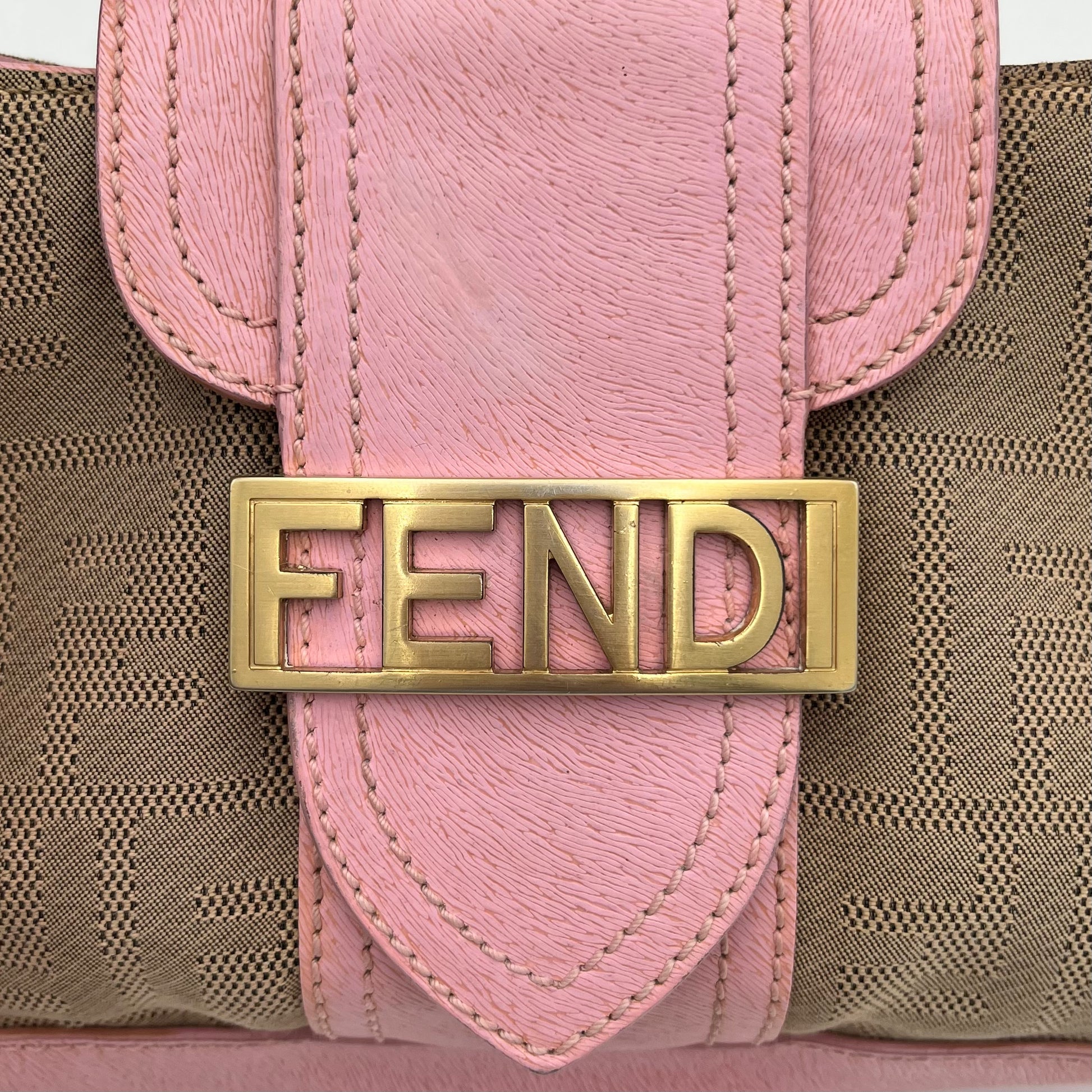 Fendi Beige Zucca Pink Leather Logo Plate Baguette