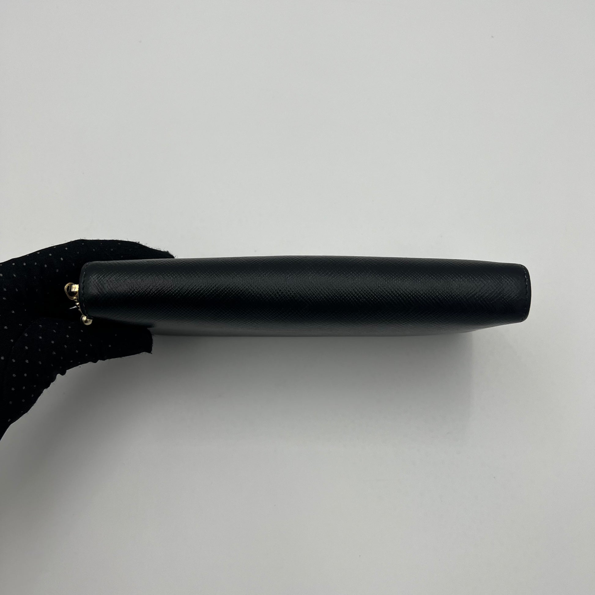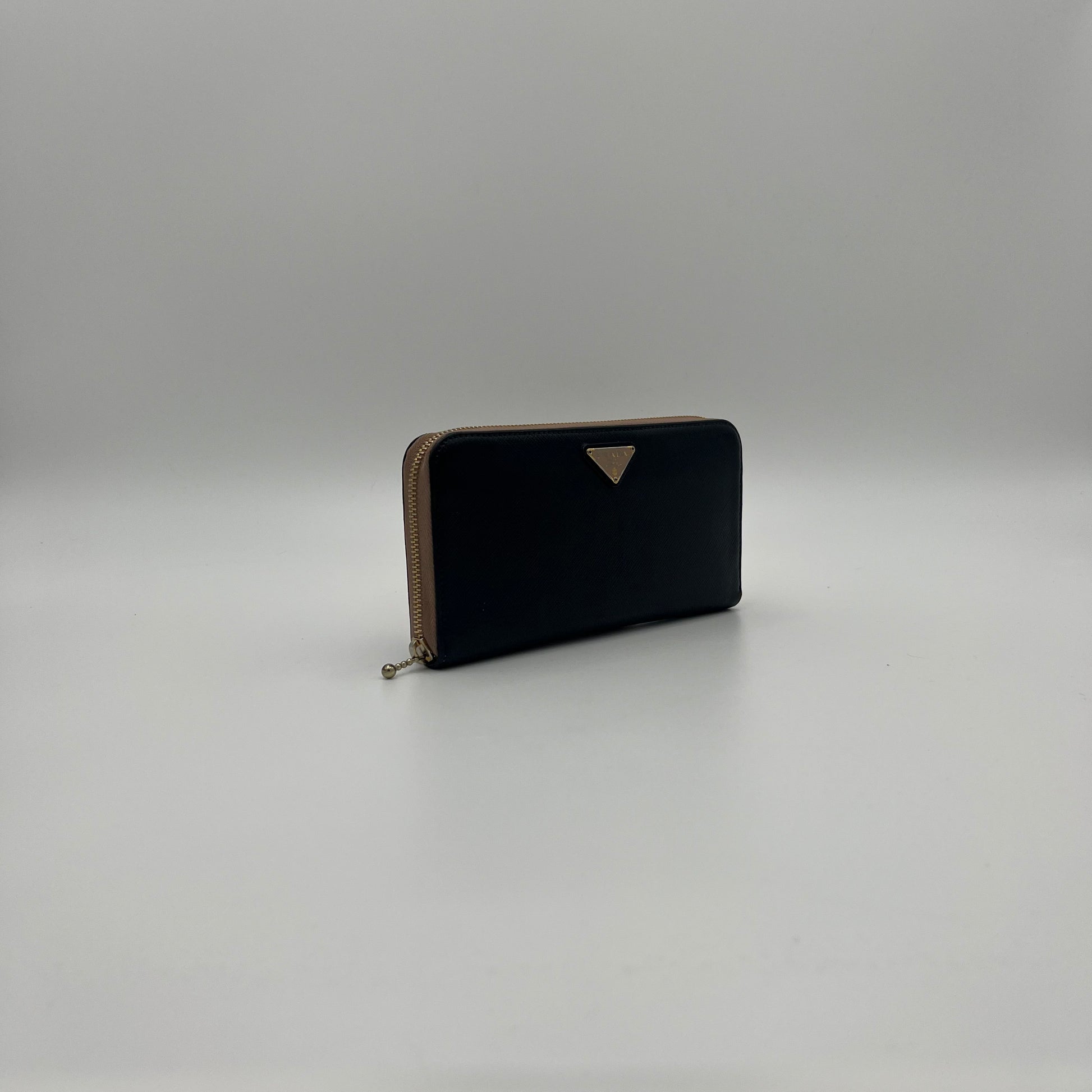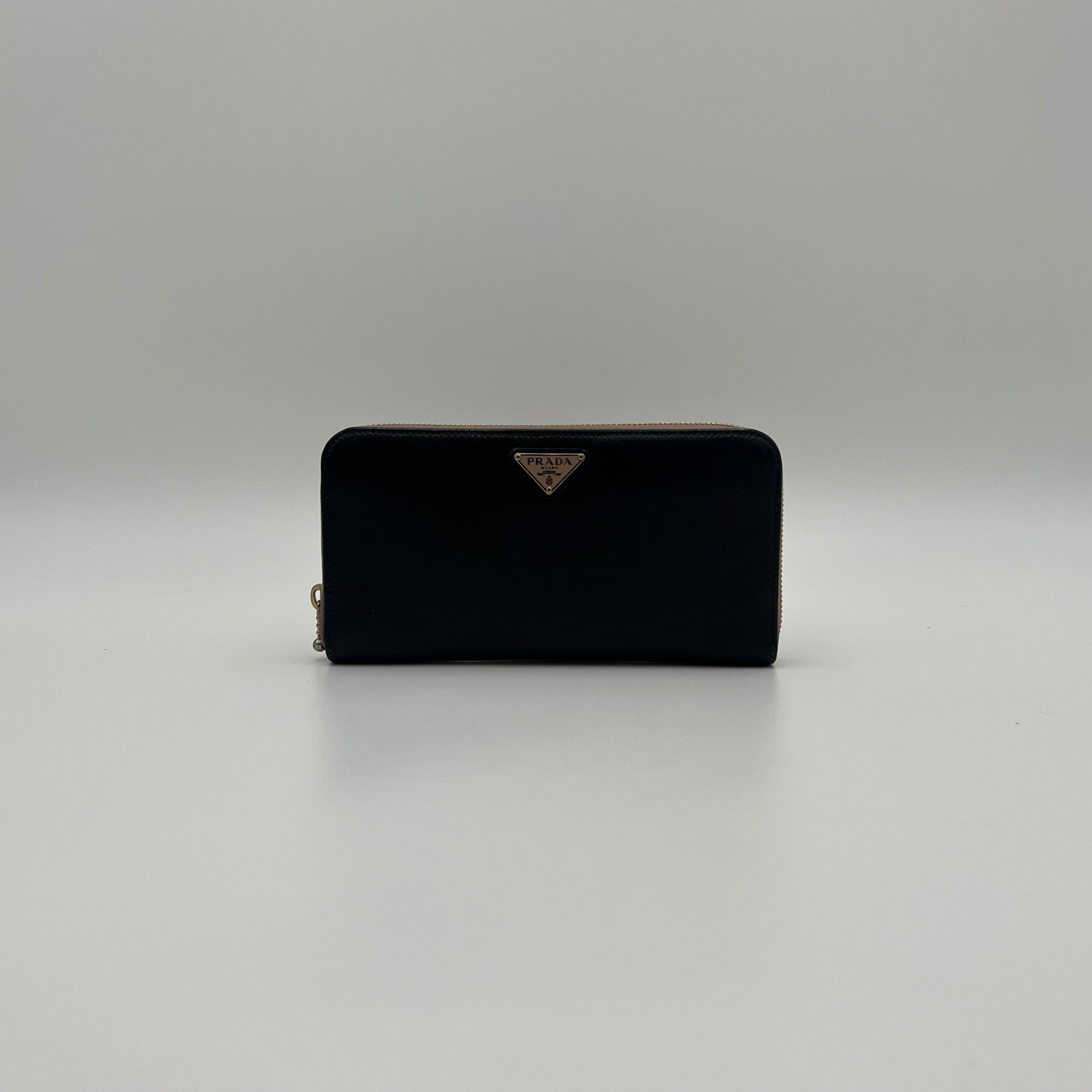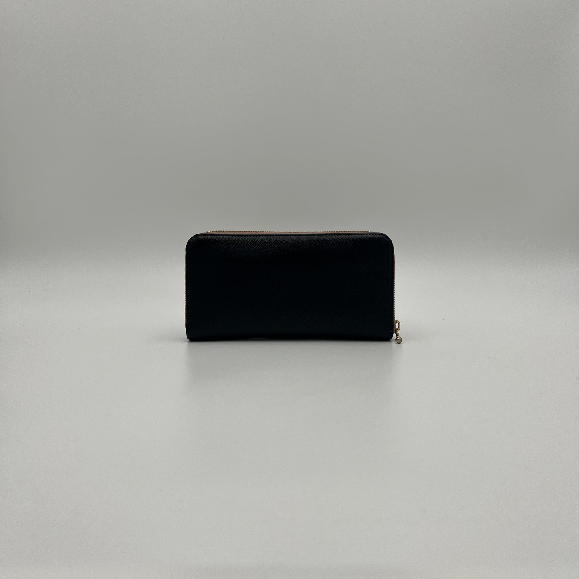 Prada Black Saffiano and Nude Pink Plate Long Zip Around Wallet